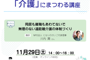 今や介護をはじめとするケアは性別を問わず誰にとっても他人ごとでなく、男性も介護をする時代です。離れて暮らす親の介護に漠然とした不安を抱えながらも考えることを後回しにしたり、「親のことだから自分がやらなければ」と介護の負担を一人で背負おうとしている人もいるかもしれません。本講座では、介護が始まる前にやっておくべきこと、遠距離介護の体制づくり、介護への向き合い方・考え方、支援者との連携などについて講師よりお話をお伺いします。